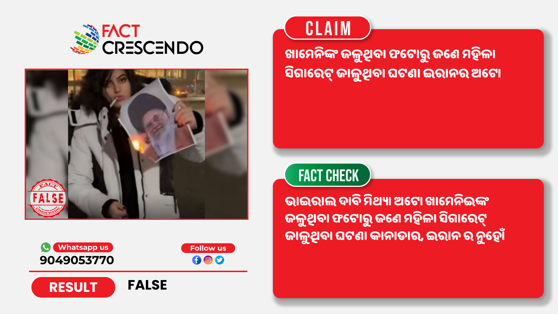 ଏହି ସମୟରେ, ଜଣେ ମହିଳା ଇରାନର ସର୍ବୋଚ୍ଚ ନେତା ଆୟାତୋଲ୍ଲା ଅଲି ଖାମେନିଙ୍କ ଫଟୋରେ ସିଗାରେଟ୍ ଜାଳି ନିଆଁ ଲଗାଇବାର ଏକ ଘଟଣା ଭାଇରାଲ ହେଉଛି। ଦାବି କର ଯାଉଛି ଯେ ଏହି ଘଟଣା ଇରାନରେ ଘଟିଛି।