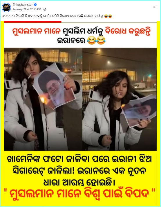 ଭାଇରାଲ ଫଟୋରେ ଲେଖା ଯାଇଛି, “ମୁସଲମାନ ମାନେ ମୁସଲିମ ଧର୍ମକୁ ବିରୋଧ କରୁଛନ୍ତି ଇରାନରେ। ଖାମେନିଙ୍କ ଫଟୋ ଜାଳିବା ପରେ ଇରାନୀ ଝିଅ ସିଗାରେଟ୍ ଜାଳିଲା! ଇରାନରେ ଏକ ନୂତନ ଧାରା ଆରମ୍ଭ ହୋଇଛି। ମୁସଲମାନ ମାନେ ବିଶ୍ବ ପାଇଁ ବିପଦ”