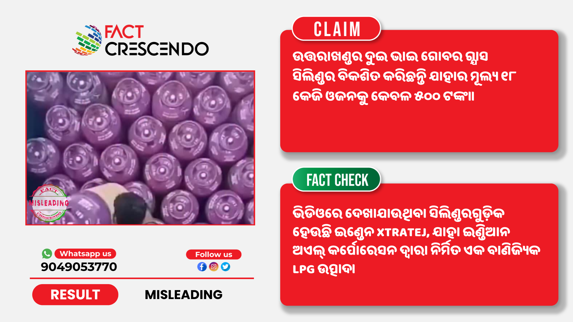 କିନ୍ତୁ ଫ୍ୟାକ୍ଟ କ୍ରିଷେଣ୍ଡୋ ଭାଇରାଲ ଦାବିକୁ ବିଭ୍ରାନ୍ତକର ବୋଲି ଜାଣିବାକୁ ପାଇଲା। ଭିଡିଓରେ ଦେଖାଯାଉଥିବା ସିଲିଣ୍ଡରଗୁଡ଼ିକ ହେଉଛି ଇଣ୍ଡେନ XTRATEJ, ଯାହା ଇଣ୍ଡିଆନ ଅଏଲ୍ କର୍ପୋରେସନ ଦ୍ୱାରା ନିର୍ମିତ ଏକ ବାଣିଜ୍ୟିକ LPG ଉତ୍ପାଦ।