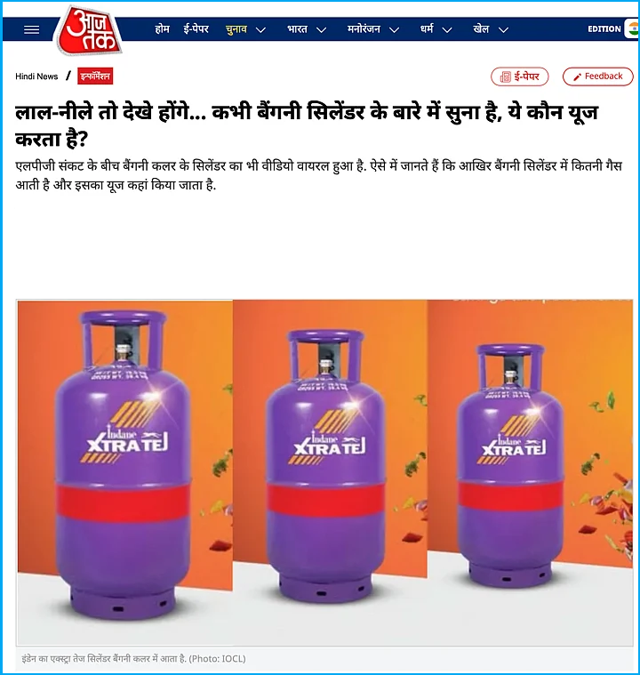 ଆମ ଅନୁସନ୍ଧାନରେ ପ୍ରଥମେ ଆମେ ବିଭିନ୍ନ ମୁଖ୍ୟଶବ୍ଦ ବ୍ୟବହାର କରି ଏହି ବାଇଗଣି ସିଲିଣ୍ଡର ବିଷୟରେ ସର୍ଚ୍ଚ କରିଲୁ। ଫଳସ୍ଵରୂପ ଆମକୁ ଆଜ୍ ତକର ଏକ ରିପୋର୍ଟ ମିଳିଲା। ରିପୋର୍ଟ ଅନୁଯାୟୀ, ଏଗୁଡ଼ିକ ଇଣ୍ଡିଆନ୍ ଅଏଲ୍ କର୍ପୋରେସନ ଲିମିଟେଡ୍ (IOCL)ର “ଇଣ୍ଡେନ ଏକ୍ସଟ୍ରା ତେଜ୍” ସିଲିଣ୍ଡର, ଯାହା ବାଣିଜ୍ୟିକ ବ୍ୟବହାର ପାଇଁ ଡିଜାଇନ୍ ହୋଇଛି ଏବଂ ୧୯ କିଲୋଗ୍ରାମ ଓଜନର।